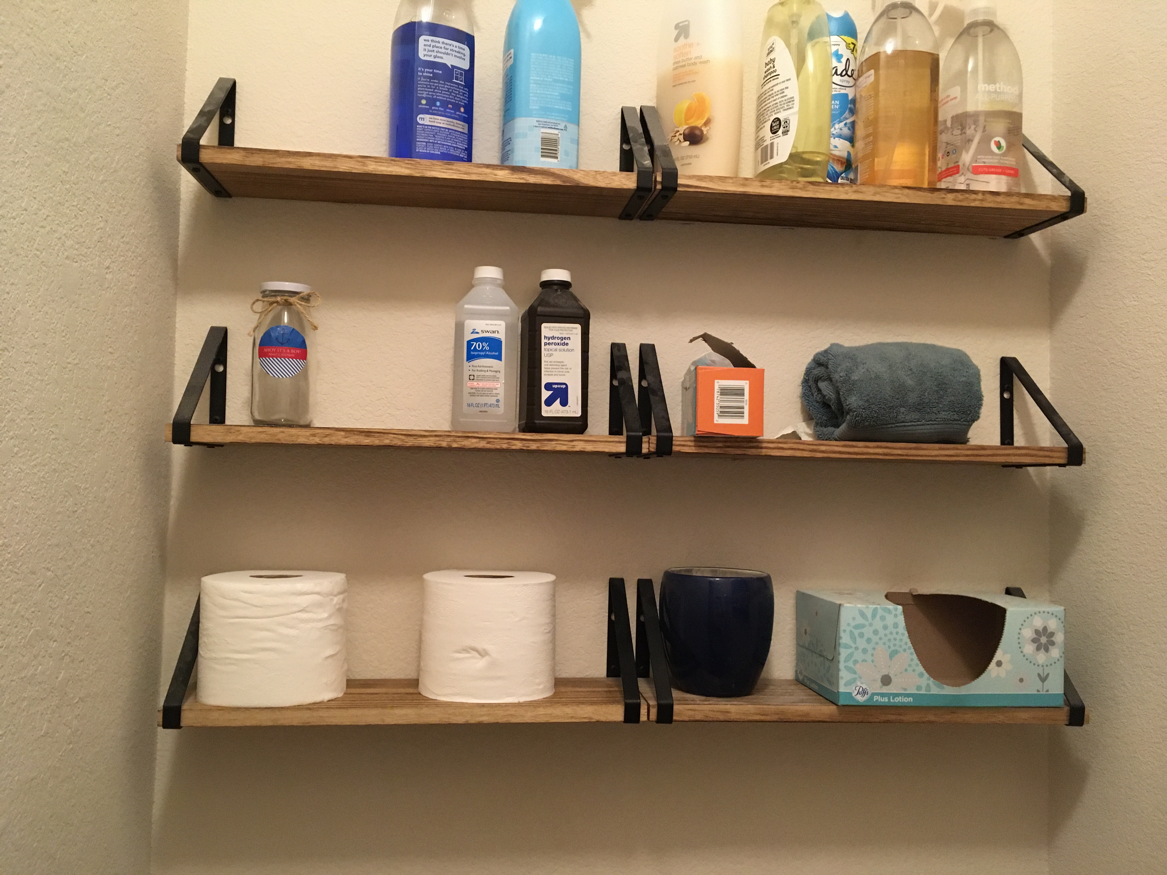 Here in our current house, we added these shelves where there was just a blank wall in the toilet closet. We keep cleaners for the bathroom, trash bags, extra hand towels, and extra toilet paper up there. Along with a painting, it made that room more homey and very much increased the storage. These shelves are actually from Amazon.